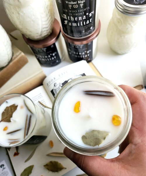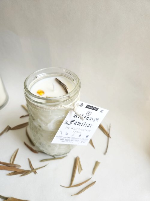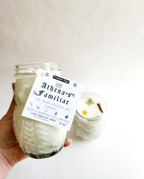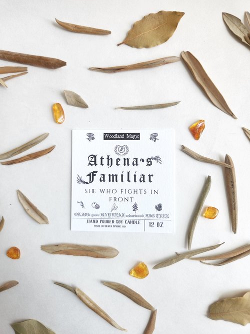 This candle celebrates Athena, the goddess of war, wisdom, and crafts, and her familiar, the little owl athene noctua. The fragrances of this candle evoke the Mediterranean landscape over which the little owl flies, combining bay leaf, sea mist, fig, and olive. Grecian olive leaves are blended into the wax, offering texture, color, and additional earthiness. As the story goes, the people of the yet unnamed Athens chose Athena’s gift of the olive tree over the offering of Poseidon. Thus the olive tree is sacred to Athena, and serves as a perch for her familiar. This offering reminds us that Athena and her familiar share the same root: one of the most common descriptors given to Athena in the works of Homer is "glaukopis," or “the bright eyed,” or “with gleaming eyes,” etymological kin to "glaux," or little owl. They are bound together by the brightness and intensity of their eyes and of the vision and scope those eyes can perceive.