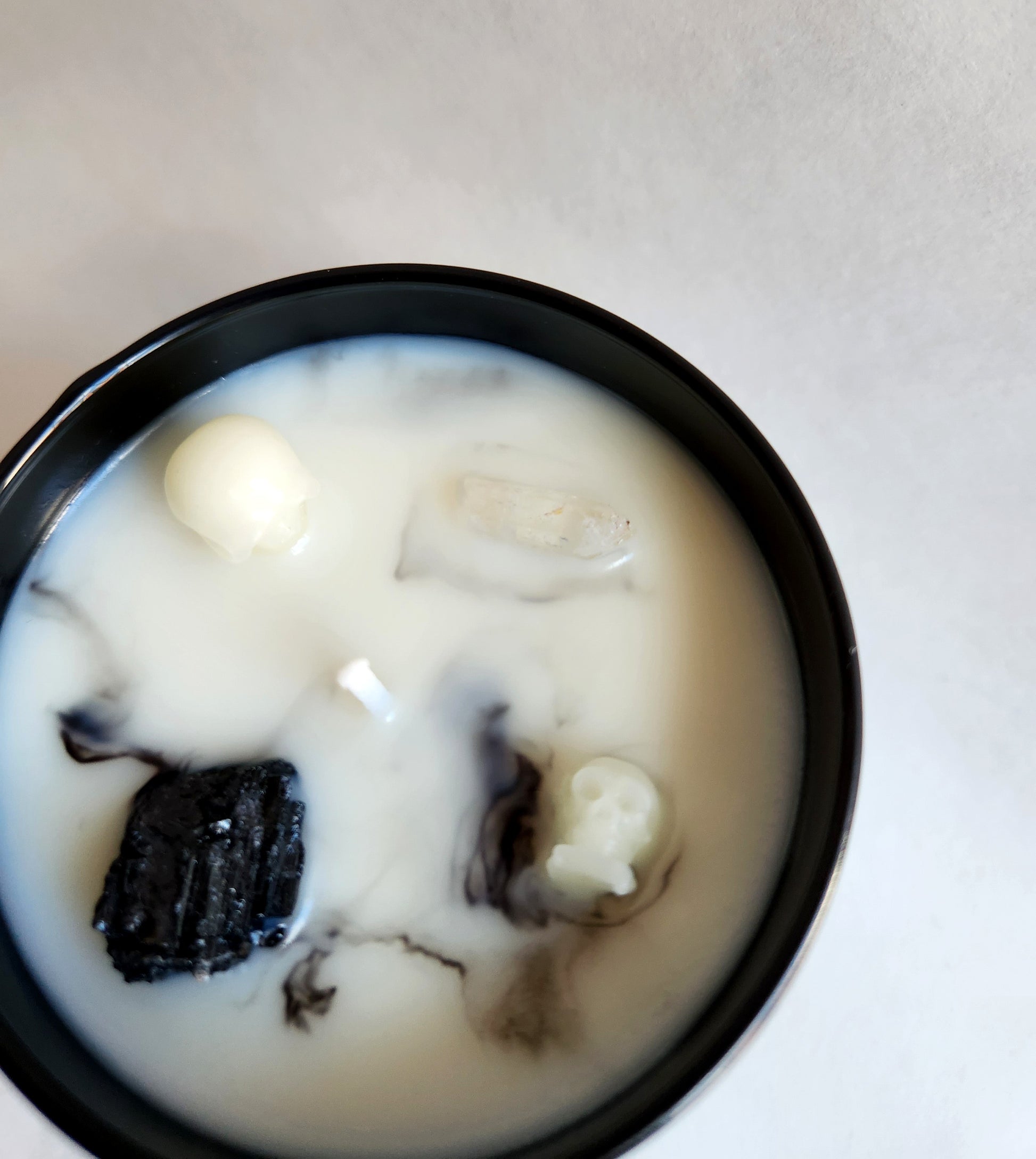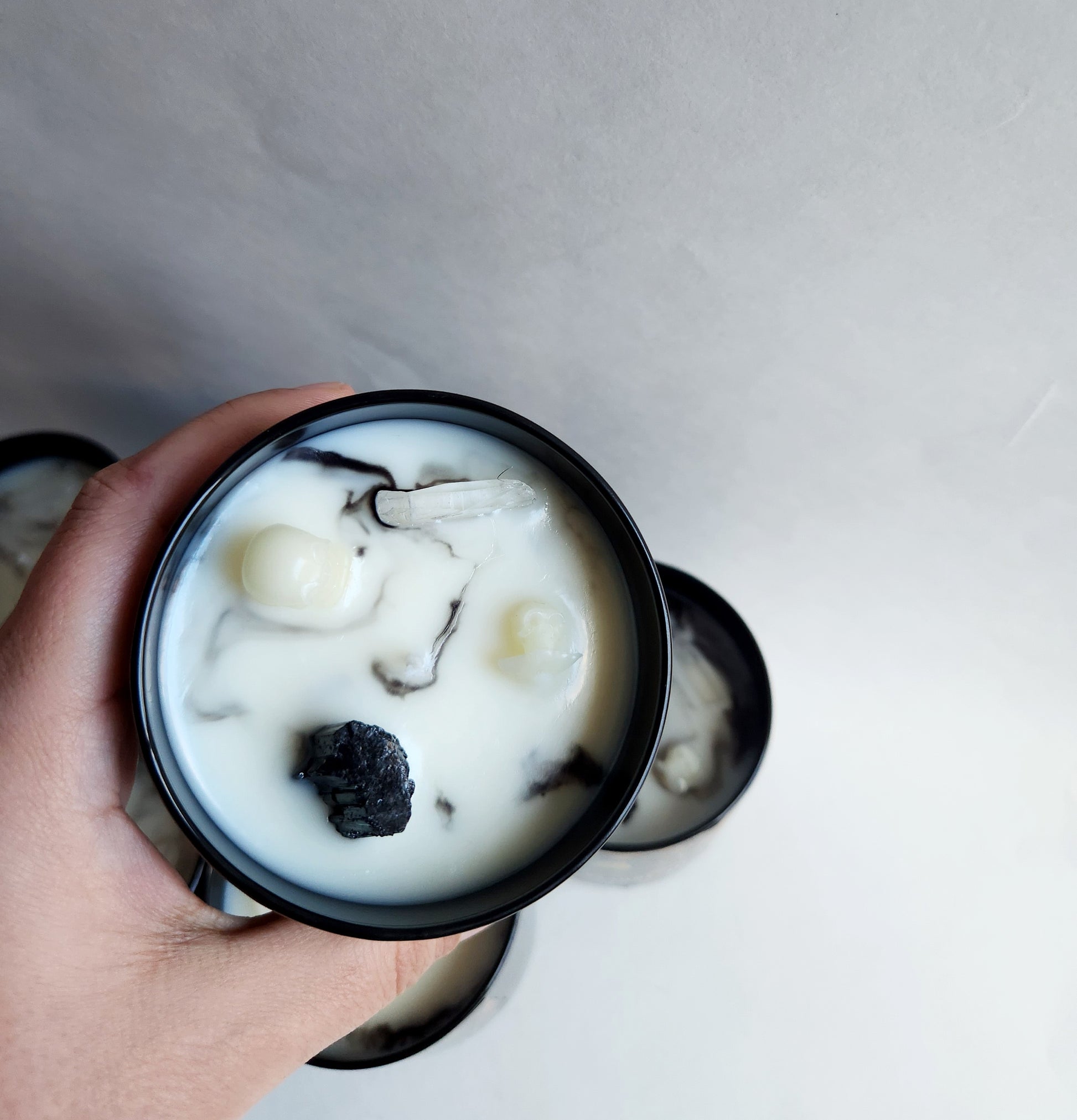 Ornamented with organic beeswax skulls, quartz, and tourmaline, this candle juxtaposes symbols of light and dark, and joins substances whose hardiness withstands the ages with those which melt at the tip of a flame. Top notes of orange peel and spiced honey blend into warm and deep scents of tonka bean, smoke, and aged wood. These fragrances remind us to enjoy the sweets of the present moment, remembering that time dissipates like smoke on a breeze.