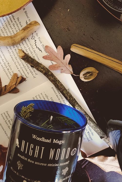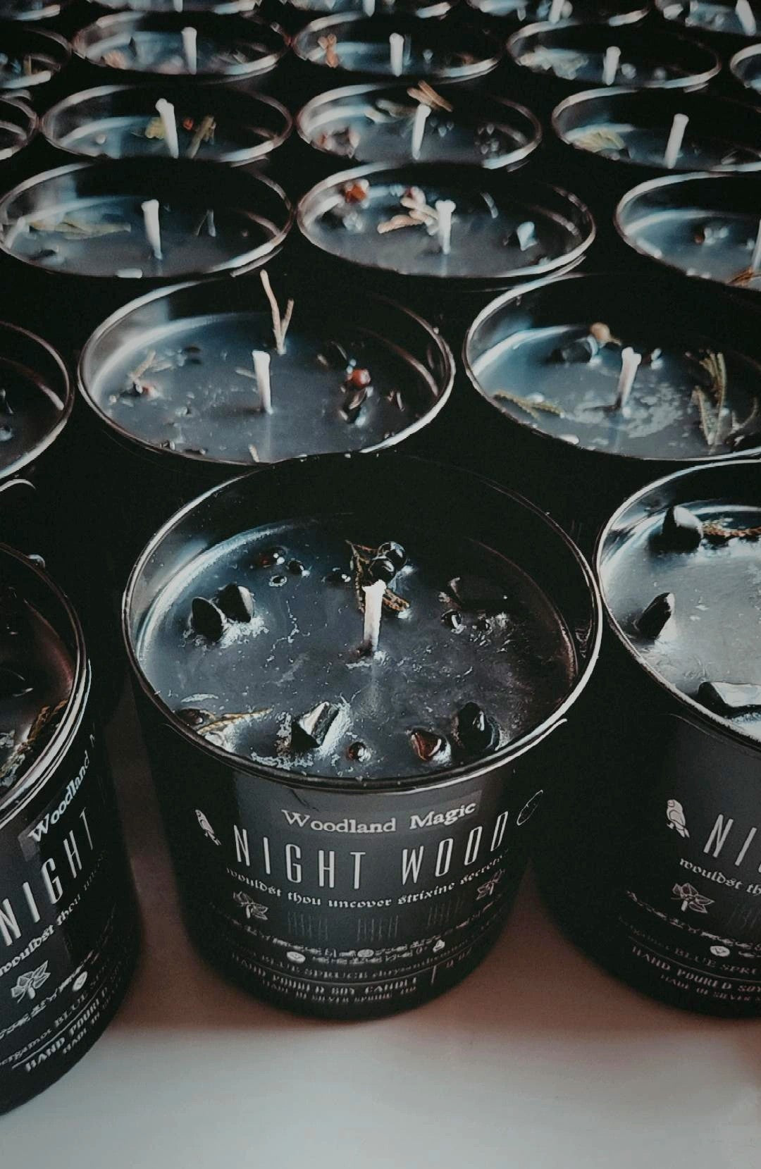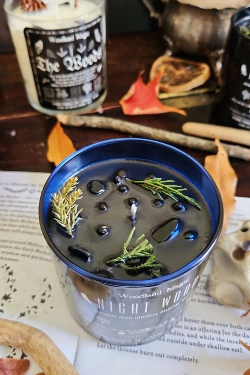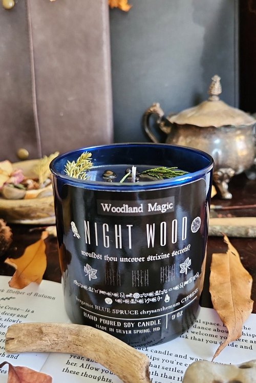 Intention and sigil-infused and poured in small batches, Nightwood candles evoke the woodland at after dark. Through the familiar aromas of spruce and birch rise a series of complex scents, meant to summon that mysterious quality of a dark forest, including chrysanthemum and bergamot. They are ornamented with a number of protective stones and plants, including obsidian and juniper berries; amber reflects the light of the flame and reminds us that the day will come again. Burn this candle when the sun sets, to enjoy the fragrances of the night, to create a forest ritual, or to inspire meditation on the woodland creatures who make the nighttime their home.