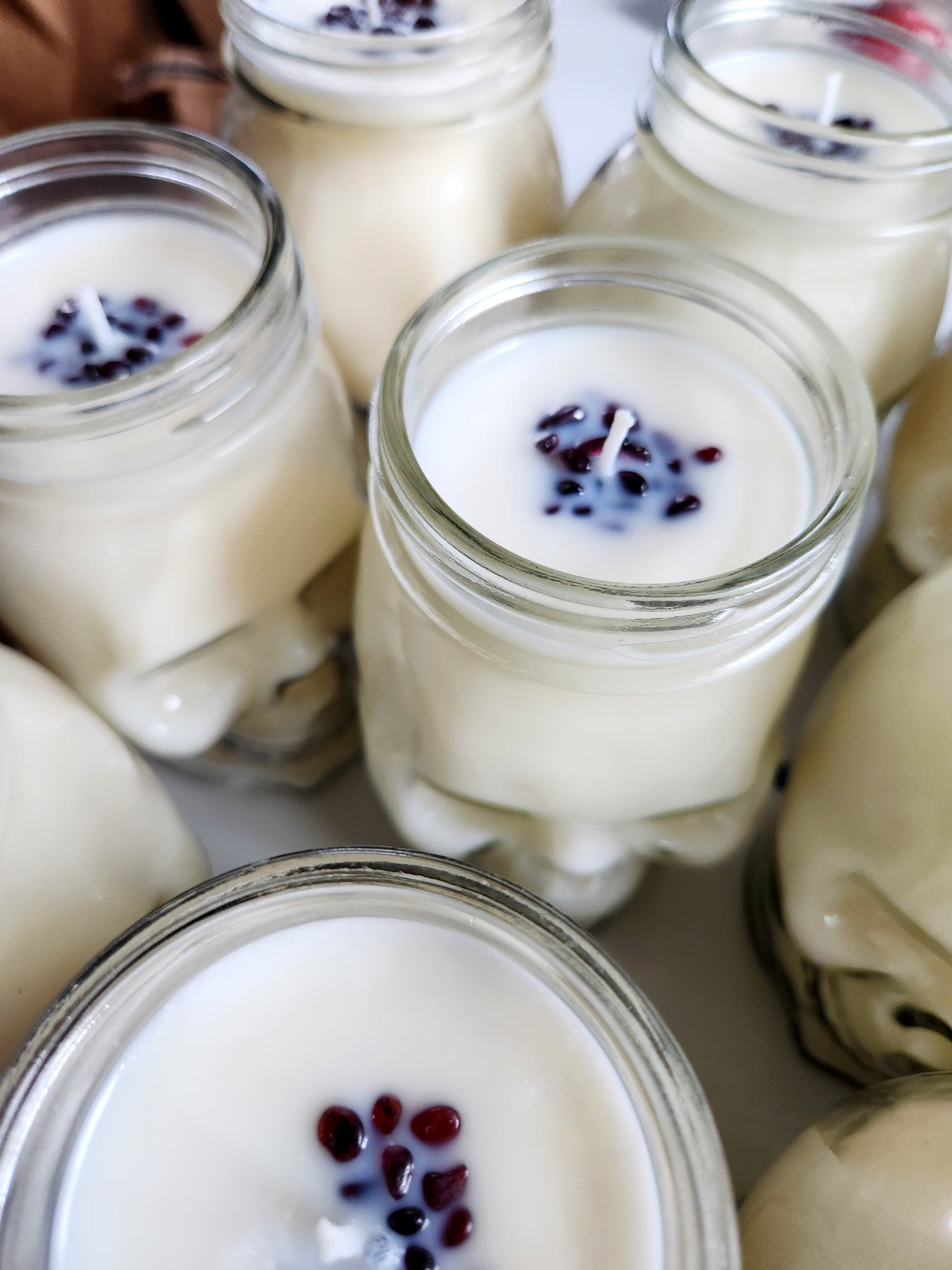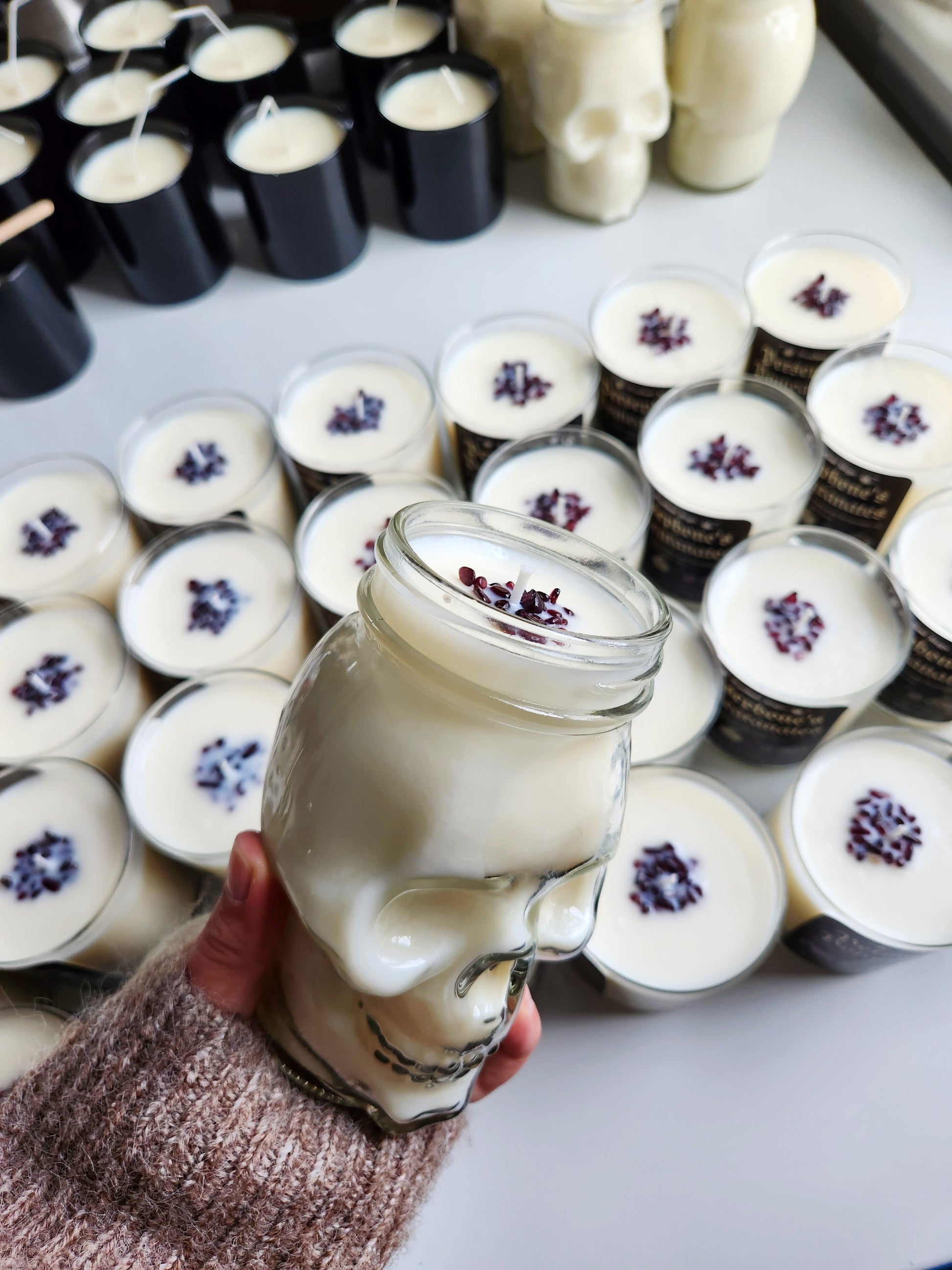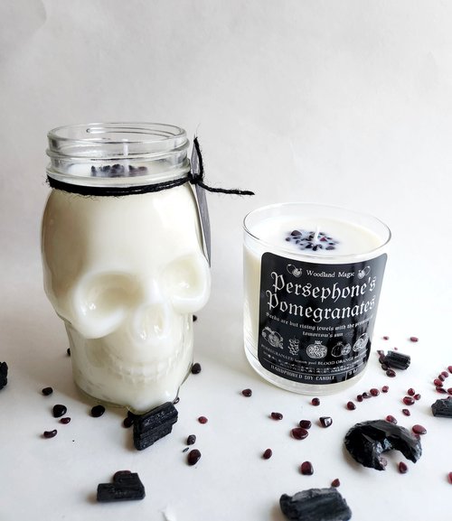 This 16 oz reusable skull mason jar is evocative of Persephone's time in the underworld. When you're finished with your candle, you can drink your iced coffee or midnight margaritas out of it!Β To reuse the container, simply wash with hot water (alternately, you can melt remnants of the candle in the oven. Line an old baking sheet with wax paper and put the candle upside down on the sheet for 20 minutes on 180 F).