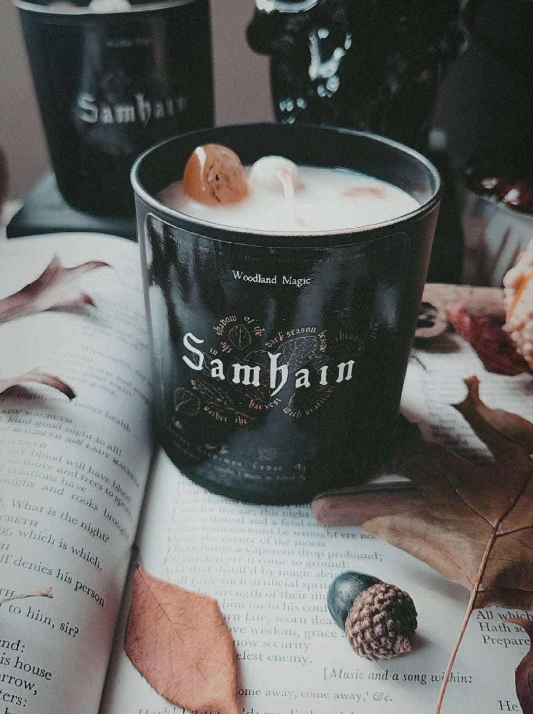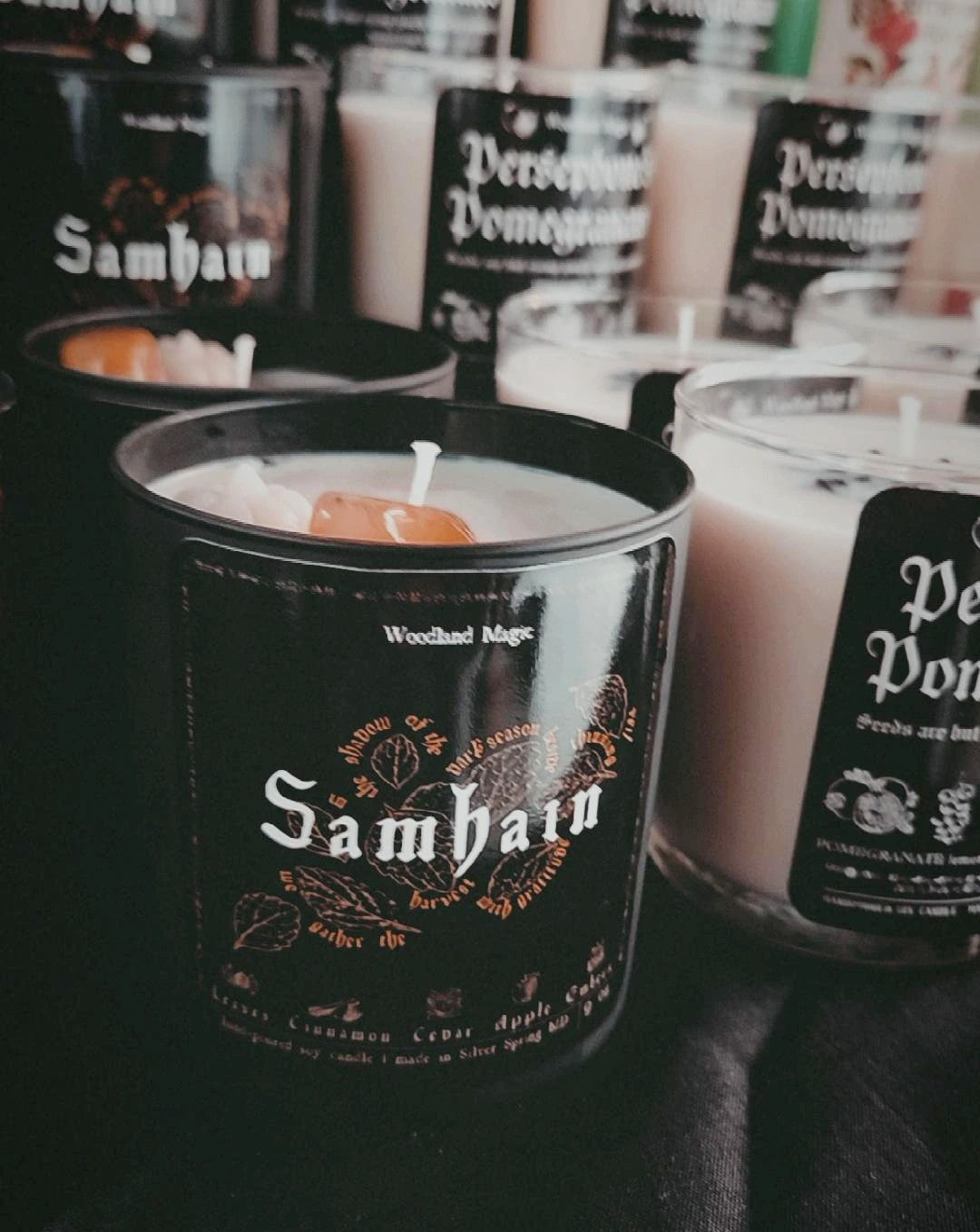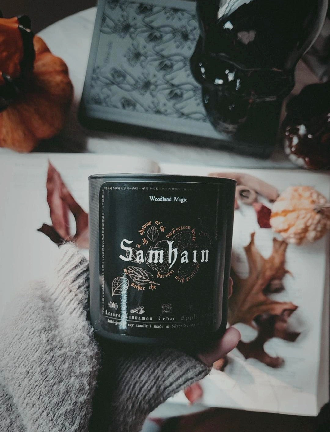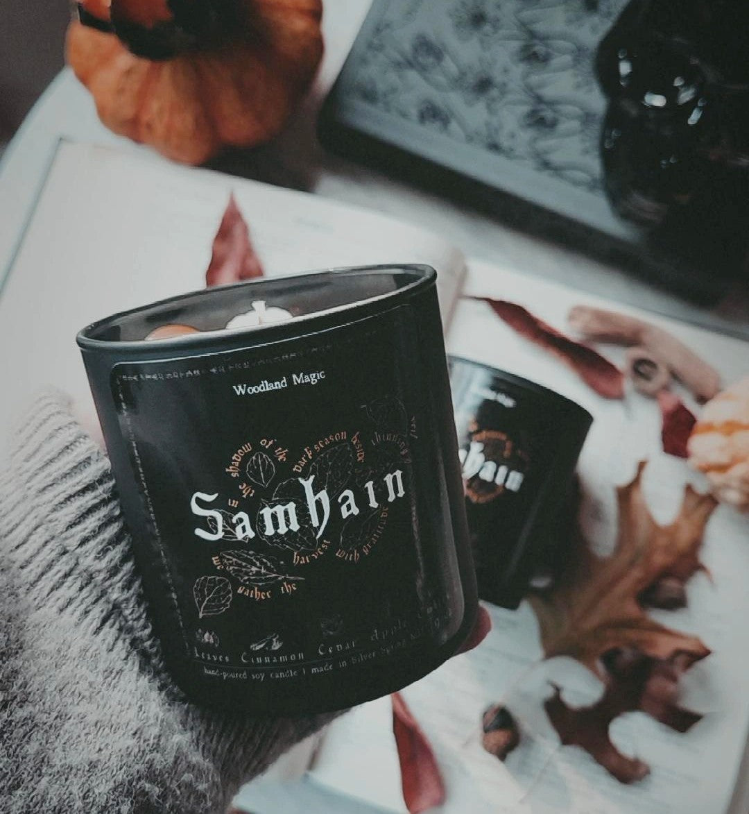 Halfway between the Autumn Equinox and Winter Solstice, Samhain marks the beginning of the dark season. Days grow shorter and colder, and we turn inside to reflect and sustain ourselves until Spring. This ritual tumbler combines the desire to celebrate and ritualize the thinning of the veil with the desire to cultivate warmth and comfort. The warming, sweet scents of cinnamon, spice, and apple blend with the autumnal crunch of fallen leaves, dry cedar, and embers, evoking the act of stepping inside to a warm hearth after a walk through the amber forest.