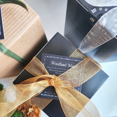 The label includes a sigil phrase in symbolic font ("We conjure the magic of the forest wherever we are in admiration and gratitude for sacred trees and woodland creatures") along with lines from a favorite woodland play--A Midsummer Night's Dream:
