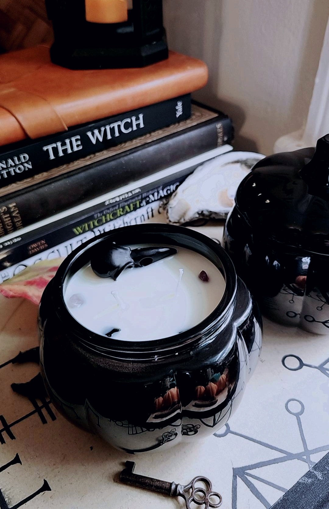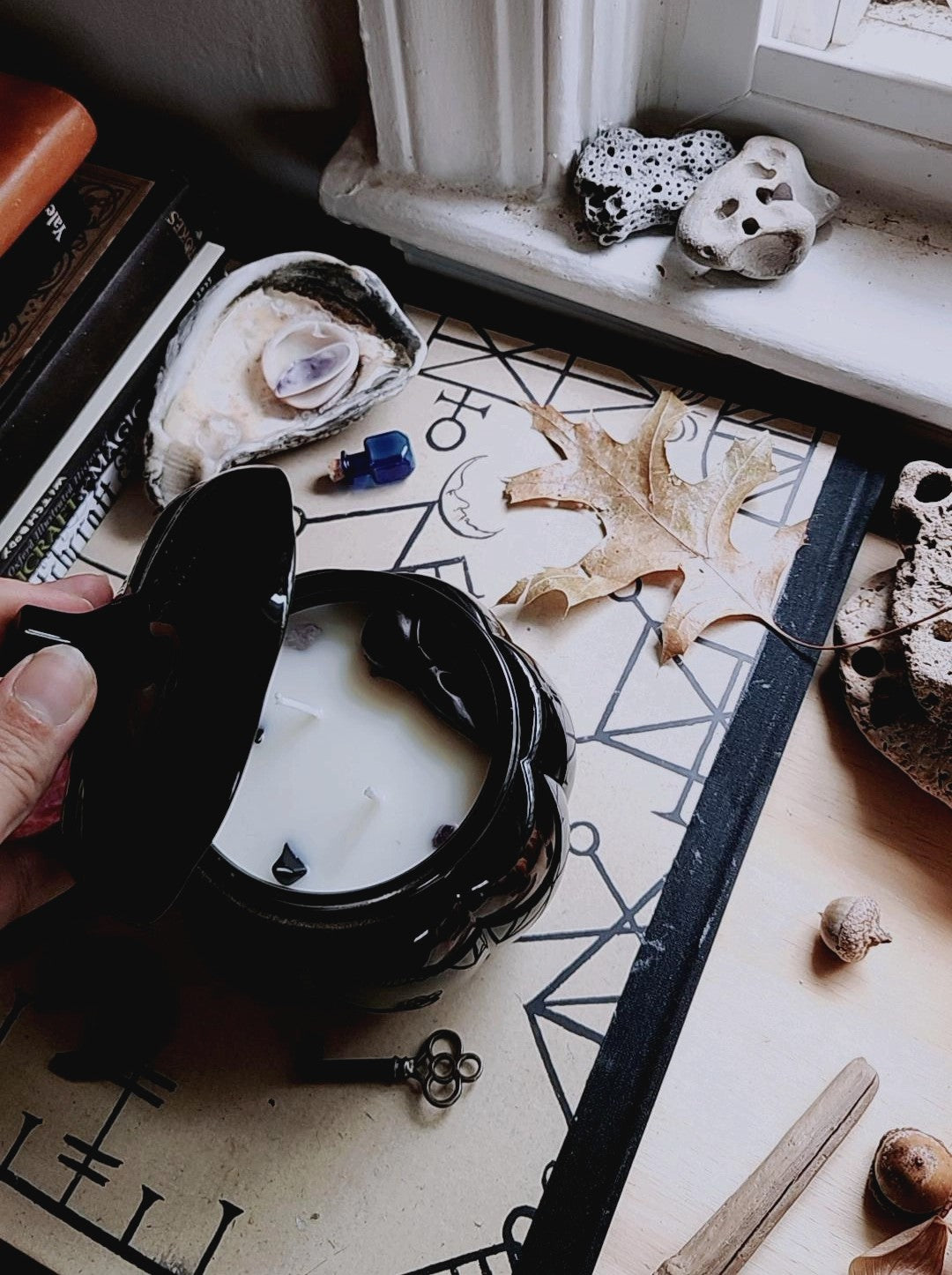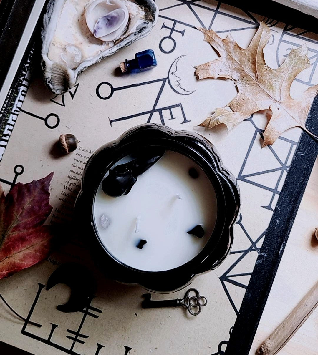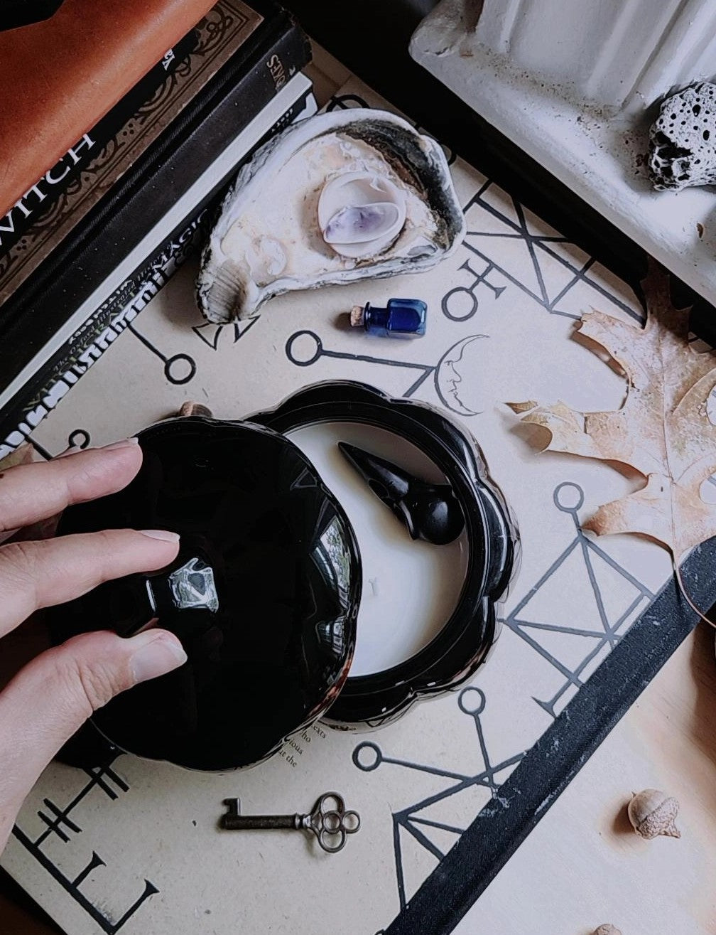 This candle takes its name from a famous line in Edgar Allan Poe's 1845 gothic poem The Raven. There is a special feeling and smell attached to books, to archives, to the process of the discovery of knowledge. Fragranced with oakmoss, firewood, birch, and archival texts, its intense and complex scent evokes old scrolls, rainy nights in library corners, forgotten tombs resting on old wooden tables, and ancient tales. The scent (re)creates the moment the scroll is unraveled, the dust is gently brushed from the book, the moment when the light flickers as you read the word you sought. Amethyst and obsidian ornament the top of the candle and curve alongside a black raven skull, made from organic beeswax and scented with birch. As the candle burns, the raven will slowly melt into the rest of the wax, leaving black and grey swirls.