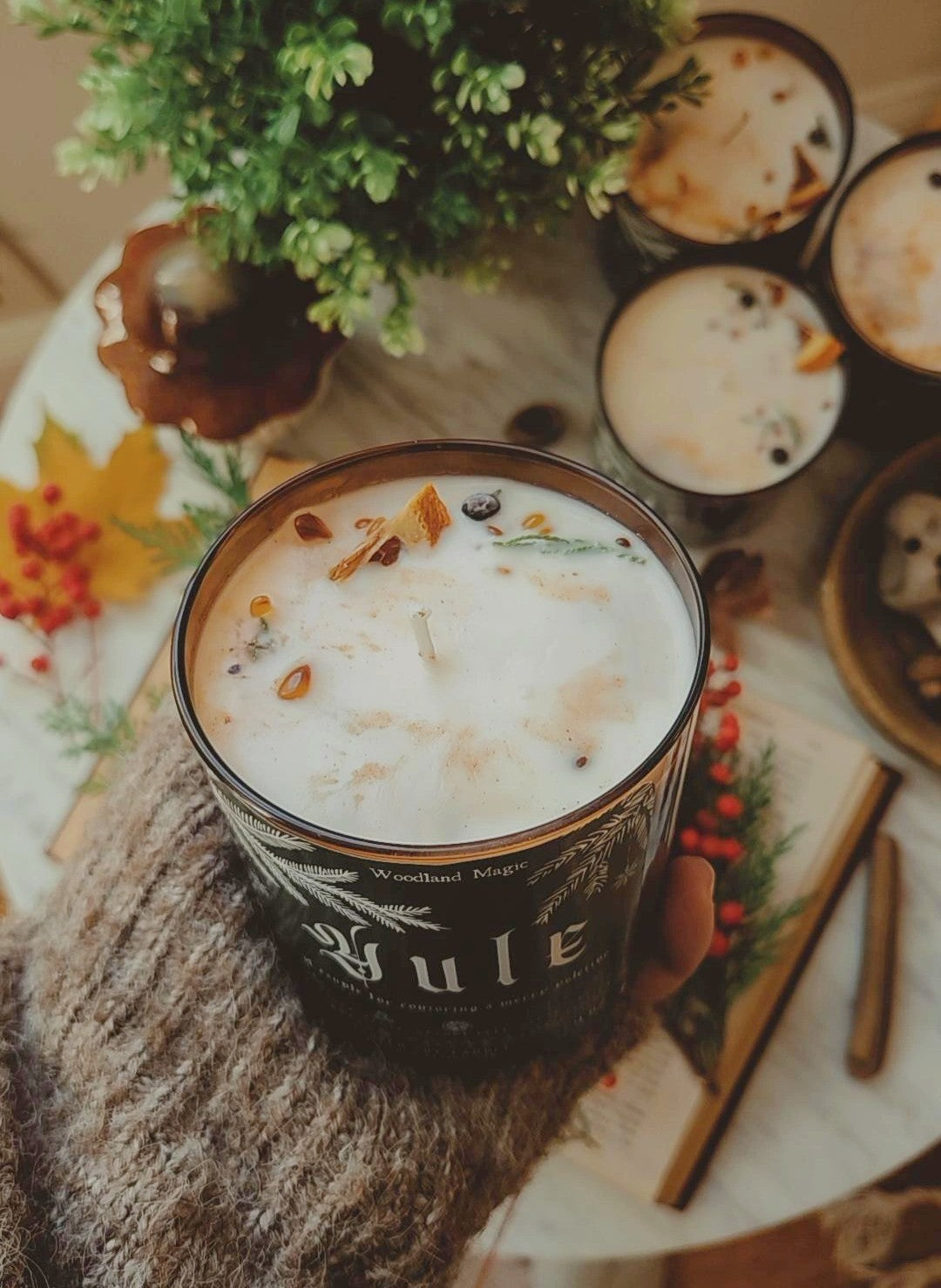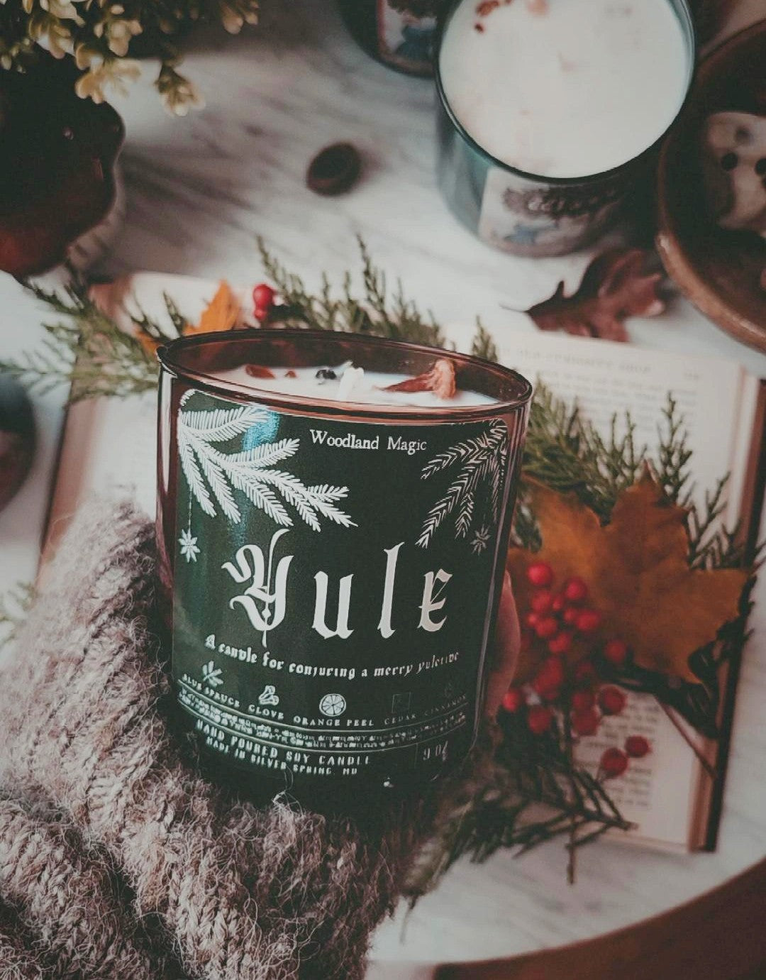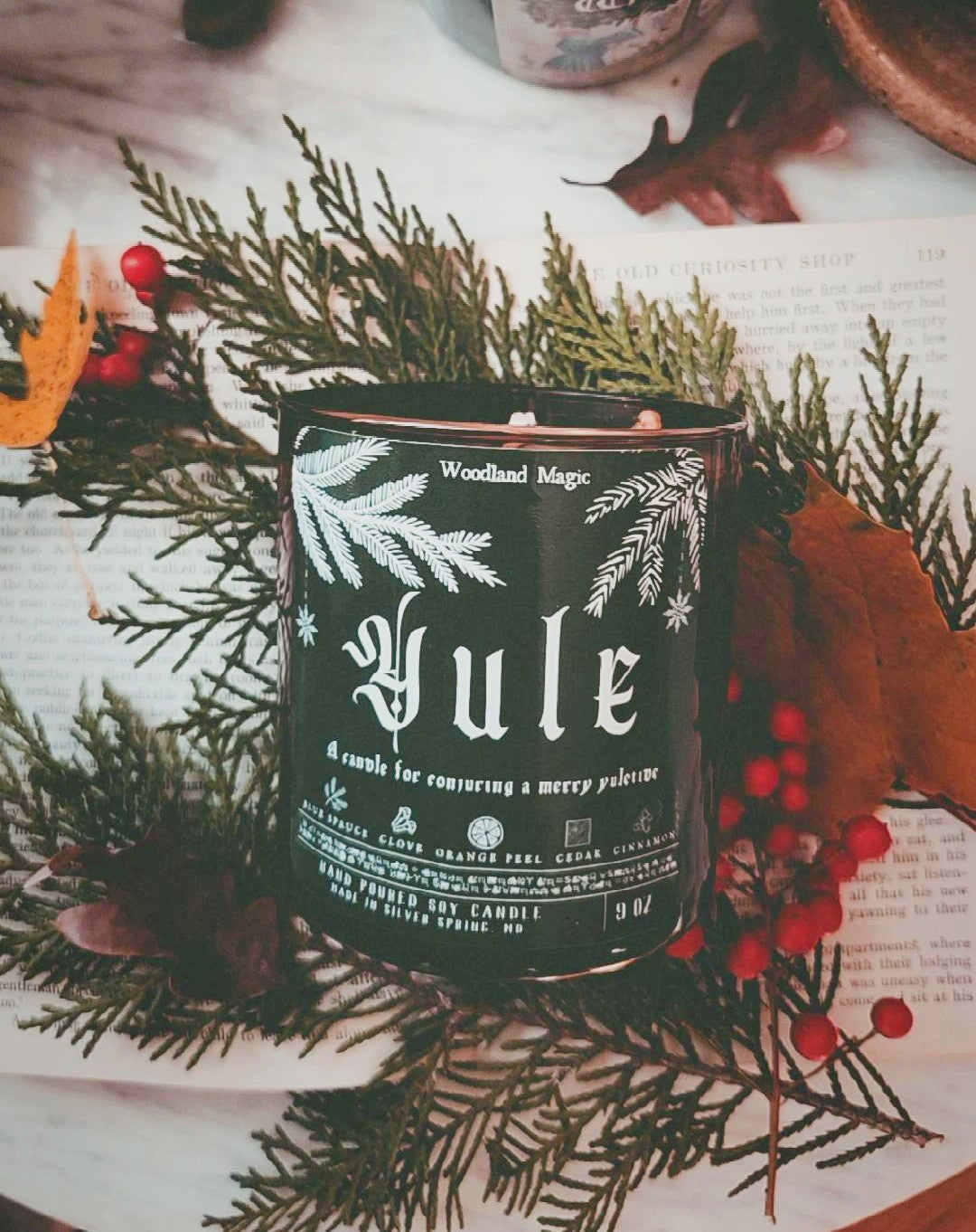Merry Yuletide! Hand poured in small batches, these soy candles are infused with the joy and brightness of Yule. They are scented to evoke the winter woods and the cozy kitchen; the deep smoky character of cedarwood and frankincense is buoyed by the bright notes of orange and blue spruce and carried with the smell of warm spice. Decorated with with spices, these candles could burn quietly in the background as you bake seasonal bread or cookies. The smell is instantly transporting and brings holiday cheer to any space.