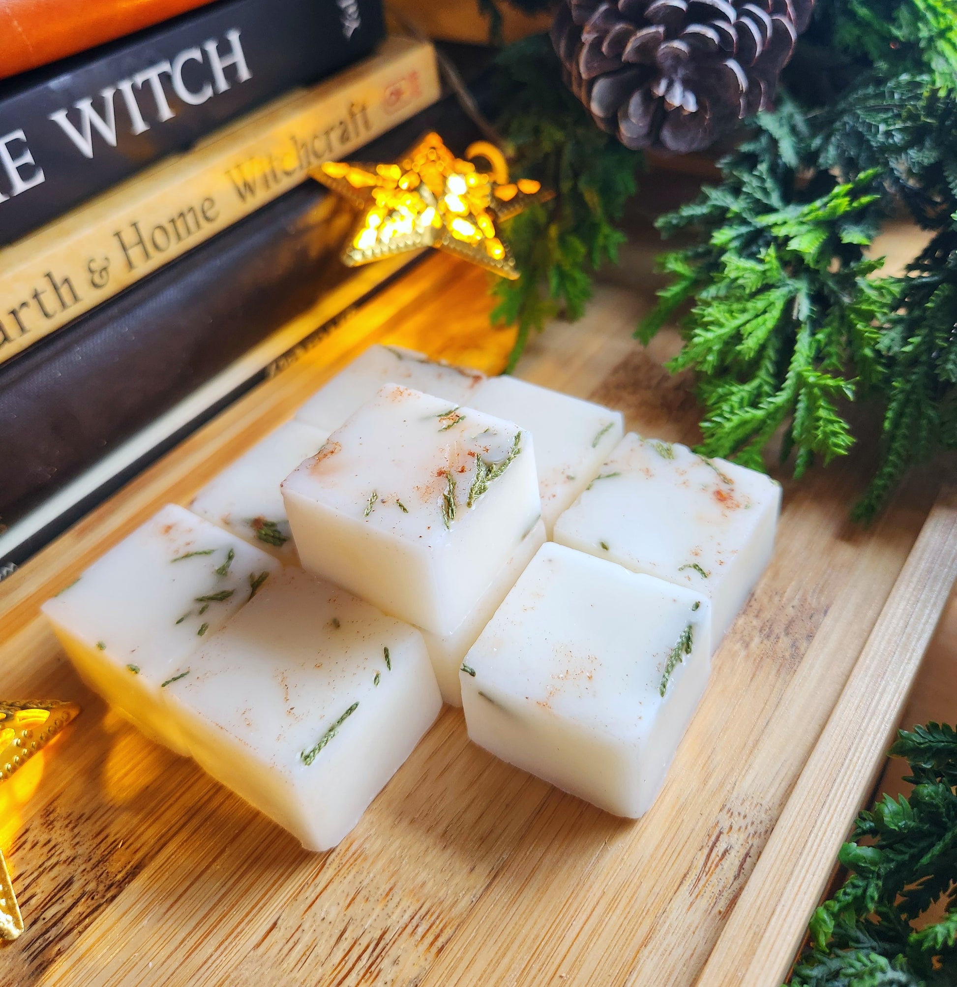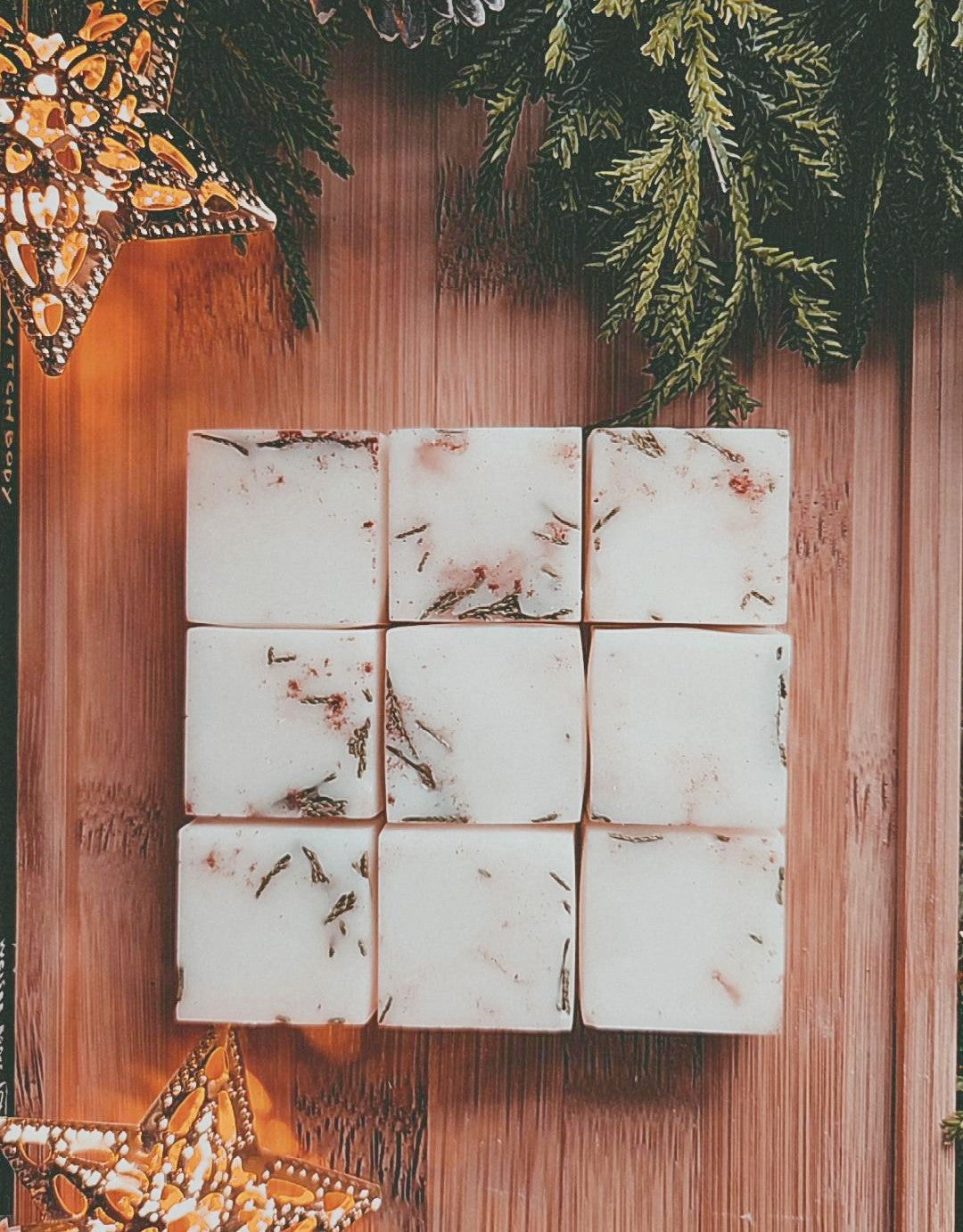Merry Yuletide! Hand poured in small batches, these 100% soy wax melts are infused with the joy and brightness of Yule. They are scented to evoke the winter woods and the cozy kitchen; the deep smoky character of cedarwood and frankincense is buoyed by the bright notes of orange and blue spruce and carried with the smell of warm spice. Decorated with with spices, these candles could burn quietly in the background as you bake seasonal bread or cookies. The smell is instantly transporting and brings holiday cheer to any space.